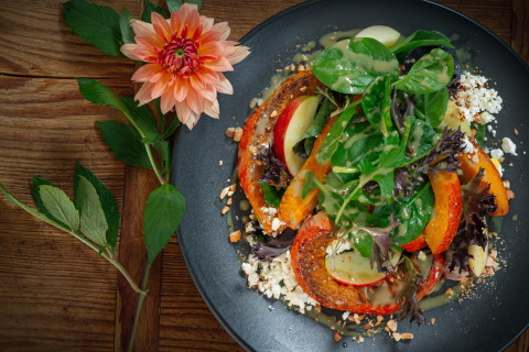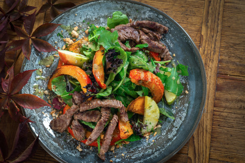 Knackiger Wildkräutersalat mit gebackenem Hokkaido-Kürbis, frischen Apfelspalten, gerösteten Cashewkernen und hausgemachtem Kürbis-Senfdressing, dazu Baguette C, H, I, L, 5 | 19,80€ |