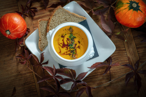 Hausgemachtes Kürbis-Cremesüppchen vom Hokkaido mit Kokosmilch und einem Schuss Kürbiskernöl, dazu Landbrot H,5,7 (vegan) | 7,10€ |