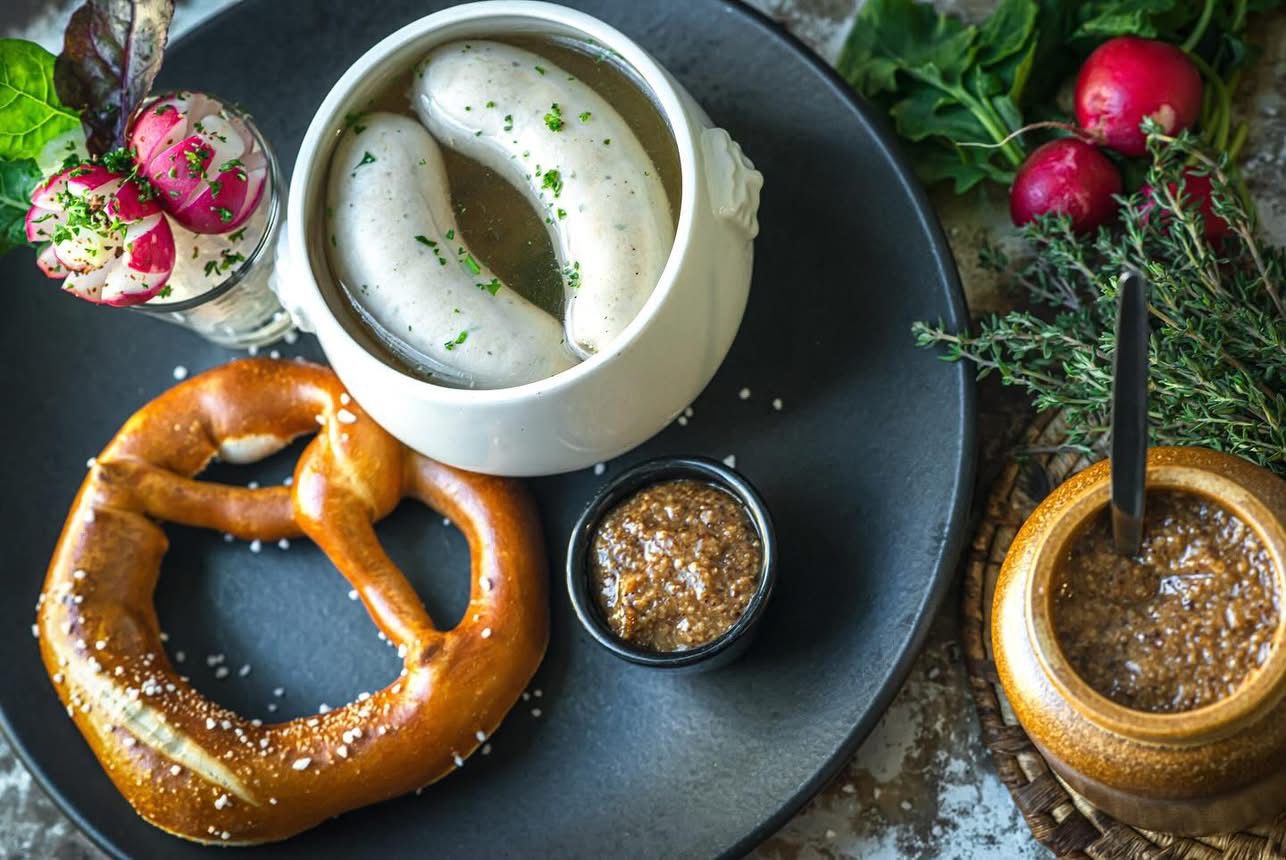 Böslebener Weißwurst mit Brezel und süßem Senf, dazu Rettich und Radieschen H, I | 9,20€ |