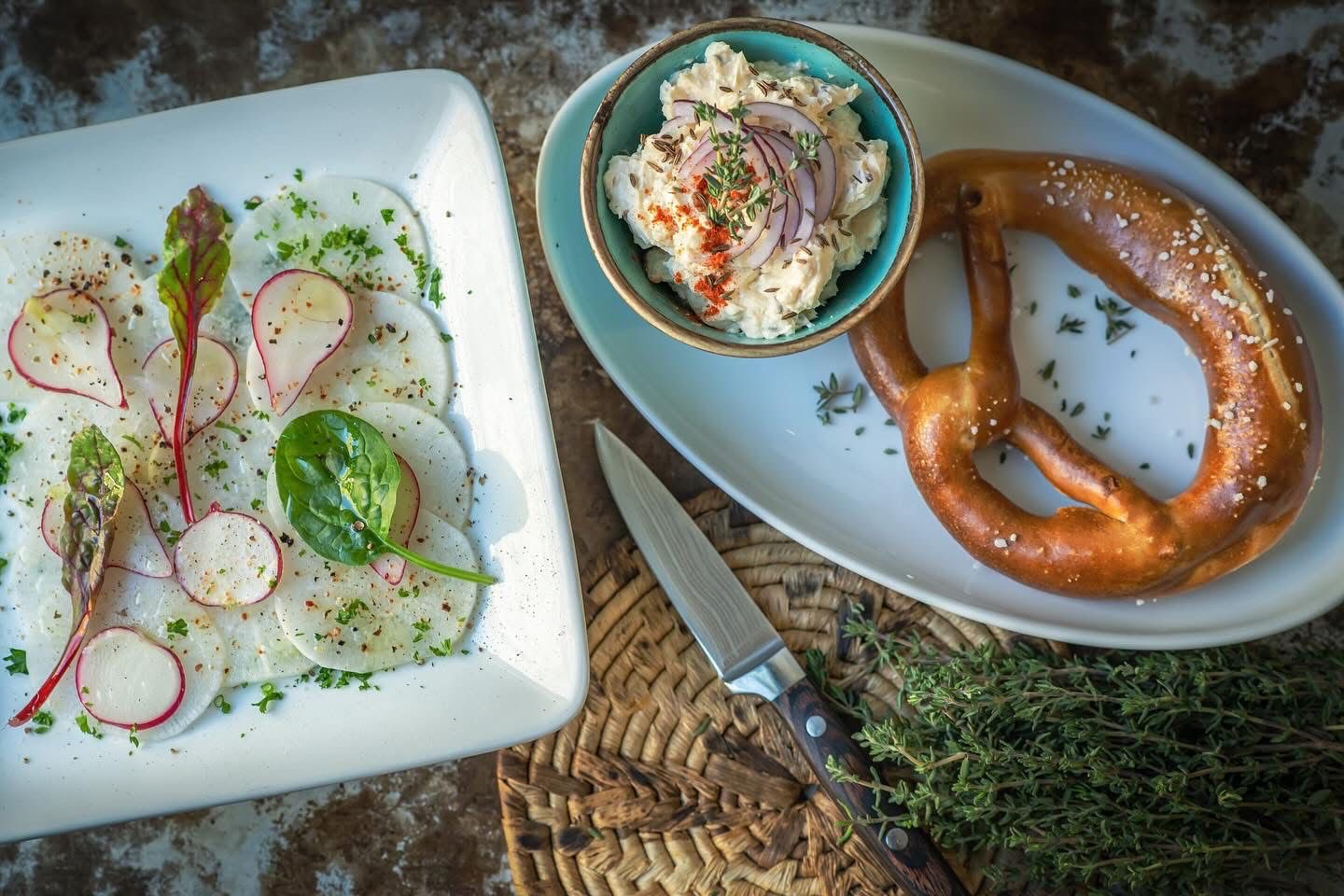 Hausgemachter Obatzda, dazu ein knackiges Rettich- Radieschen- Carpaccio und Brezel oder Brot C, H (vegetarisch) | 9,40€ |