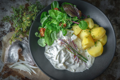| Marinierter Hering mit Kartoffeln und Salatgarnitur C,I,N,5 | 10,90€ |