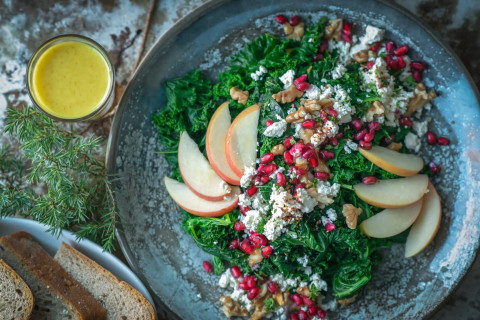 | Winterlicher Grünkohlsalat mit Apfel, Feta, Walnuss, Granatapfel und Honig-Senf-Dressing, dazu Landbrot C,H,I,5 (vegetarisch) | 9,90€ |